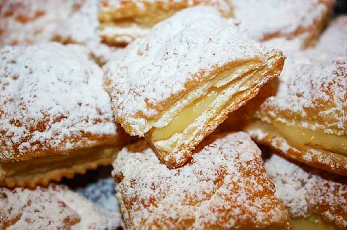 Sporcamuss: Conosciuti anche come Sporcamusi o Stusciamuss. Un po’ difficili da trovare, ma vale la pena cercarli! Si tratta di due quadratini di pasta sfoglia croccante che racchiudono un ripieno morbido di Crema pasticcera, o Crema diplomatica. Spolverati di zucchero a velo vengono serviti caldi e prendono il buffo nome perché quando si addentano è impossibile non sporcarsi la bocca!